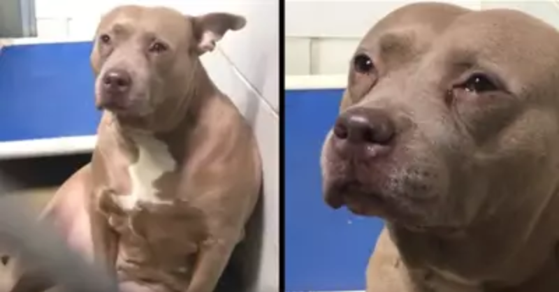 Depressed pit bull filmed ”crying” at shelter after being used for breeding then dumped