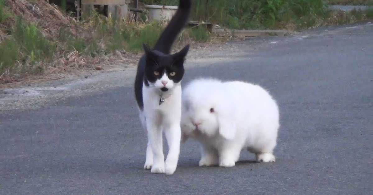 Fluffy Bunny And Adorable Cat Furiend Take A Walk Together Every Day