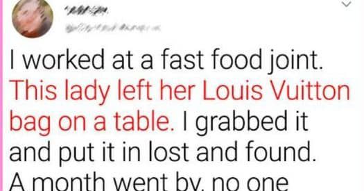 One day, I was working at a fast food restaurant when this lady left her Louis Vuitton bag on the table. I waited about 20 minutes yet...