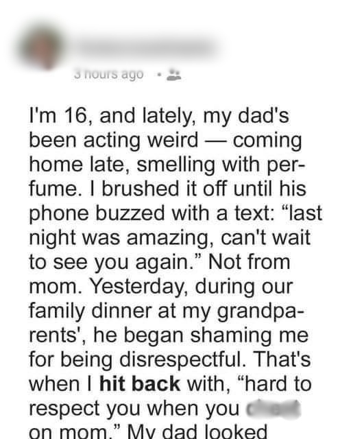 A 16-year-old revealed that her father has been dishonest on her mother in front of the entire family.