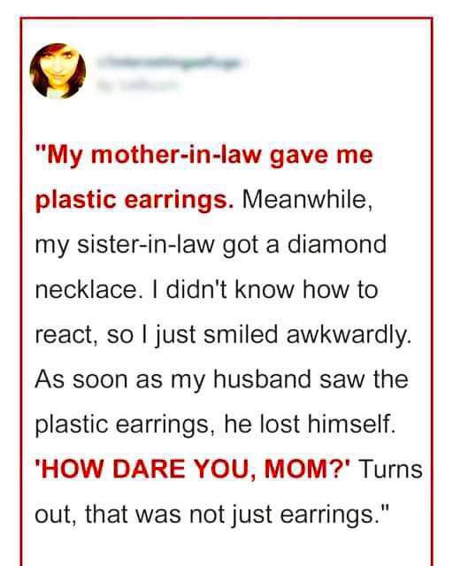 When my wife’s mother gifted me plastic earrings while giving my sister-in-law a diamond necklace, it sparked a family drama. My husband was furious, and tensions ran high....