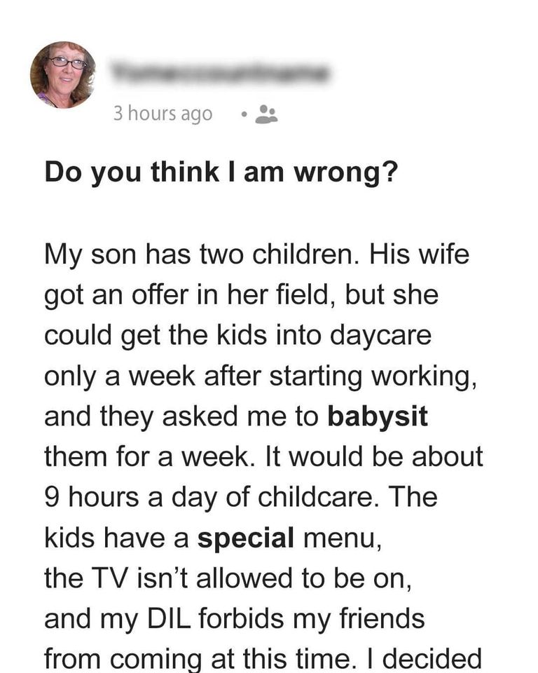 A grandmother faced a dilemma when her daughter-in-law, who had been a stay-at-home mom for four years, asked her to babysit her two children, aged four and two,...