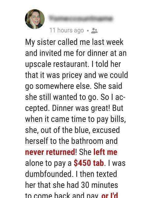 Woman’s sister invited her to a fancy restaurant, then her sister left the woman to pay the bill