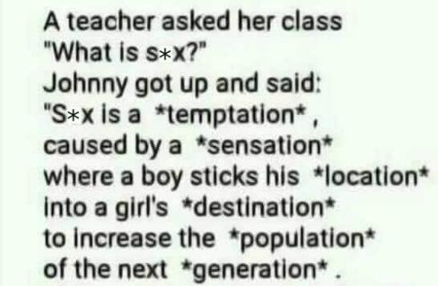 A teacher asked her class “What is s*x?” Johnny got up and said: “S*x is a *temptation*, caused by a *sensation*, where a boy sticks his *location* into...