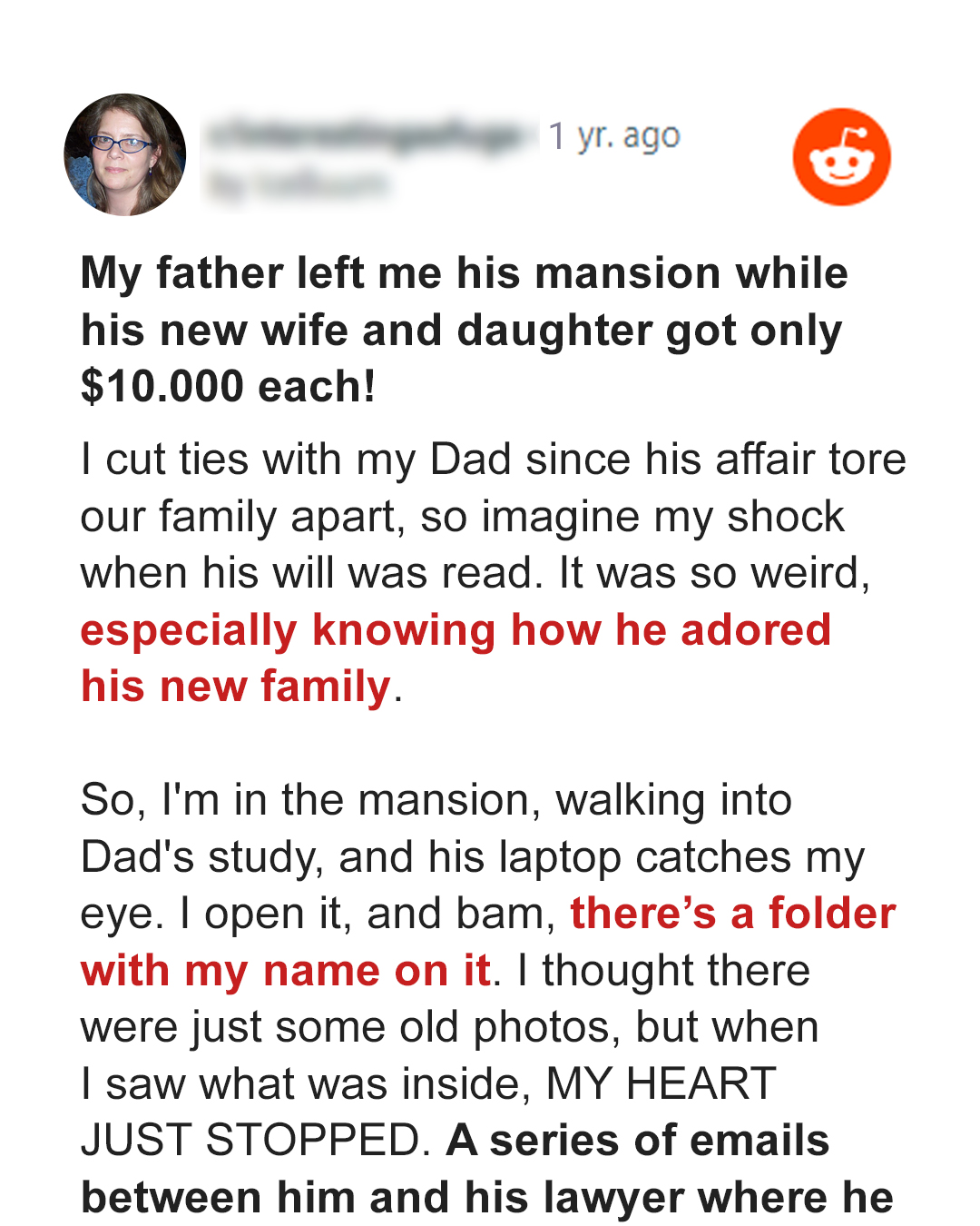 My father left me his mansion while his New Wife and Daughter got only $10,000 each